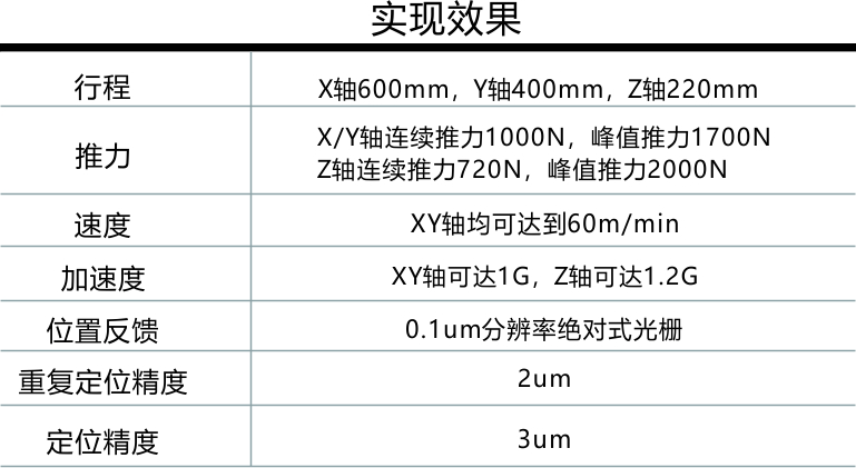 應(yīng)客戶要求:“快移速度由目前的15m/min提升至48m/min以上,重復(fù)定位精度達(dá)到0.002mm,要求加工表面效果好?!标恢静捎弥本€電機(jī)作為進(jìn)給驅(qū)動(dòng),快移速度達(dá)到60m/min。XY軸選用DLMF-0301W永磁直線電機(jī),Z軸選用DLMF-0203W永磁直線電機(jī)。